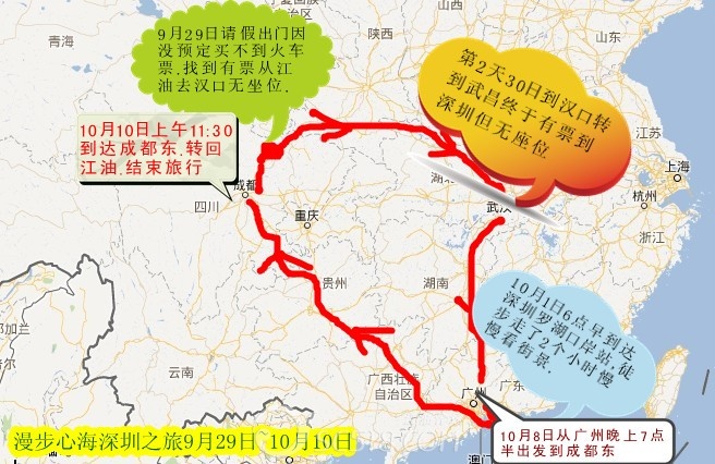 國慶節(jié)出發(fā)前計劃騎車去老成渝線,到了29日上午又改變計劃.開始了一個人背包乘火車去國際化城市---深圳,當天公司工作活兒做完了就急速回家拿身份證跑到火車站了買票.卻一票難求,俺腦子里的地圖.想到有票的漢口..