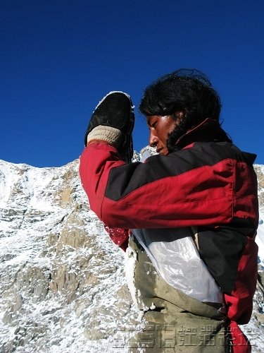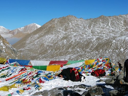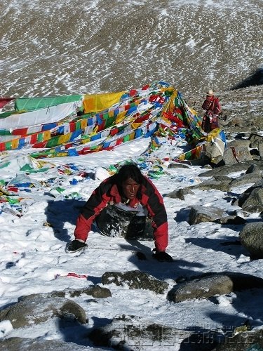 隨著腳下的窸窣聲,巖下冒出一個(gè)人頭,天哪,在這樣崎嶇陡峭的山路上、在這樣的海拔高度上,她們竟然是用一步一叩拜的方式轉(zhuǎn)山,可以想象她們經(jīng)歷了多少的艱辛和磨難。聽(tīng)說(shuō)她倆都感冒了,我立即將身上僅有的兩片感冒藥給了她們。